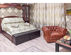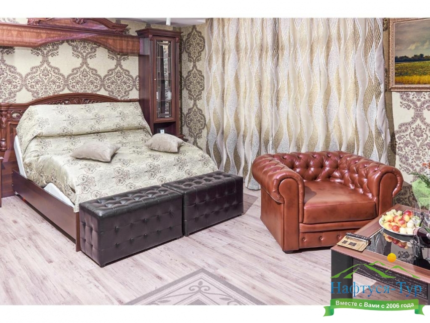 вешалка, кресла, кровать двуспальная, прикроватные тумбочки, стол, столик журнальный, стул, шкаф