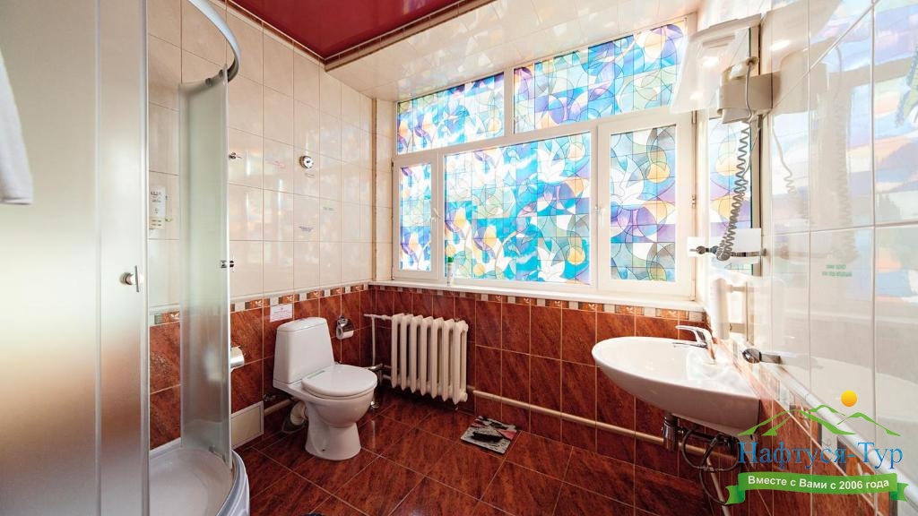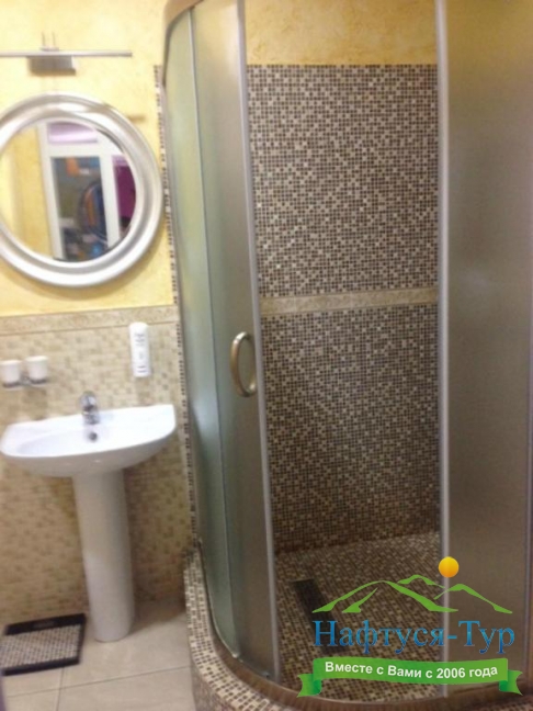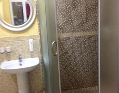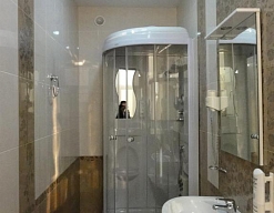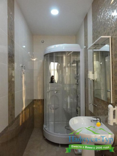 с душевой кабиной, туалетные принадлежности, фен