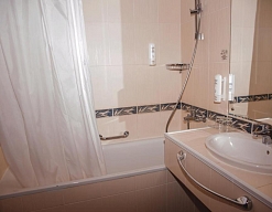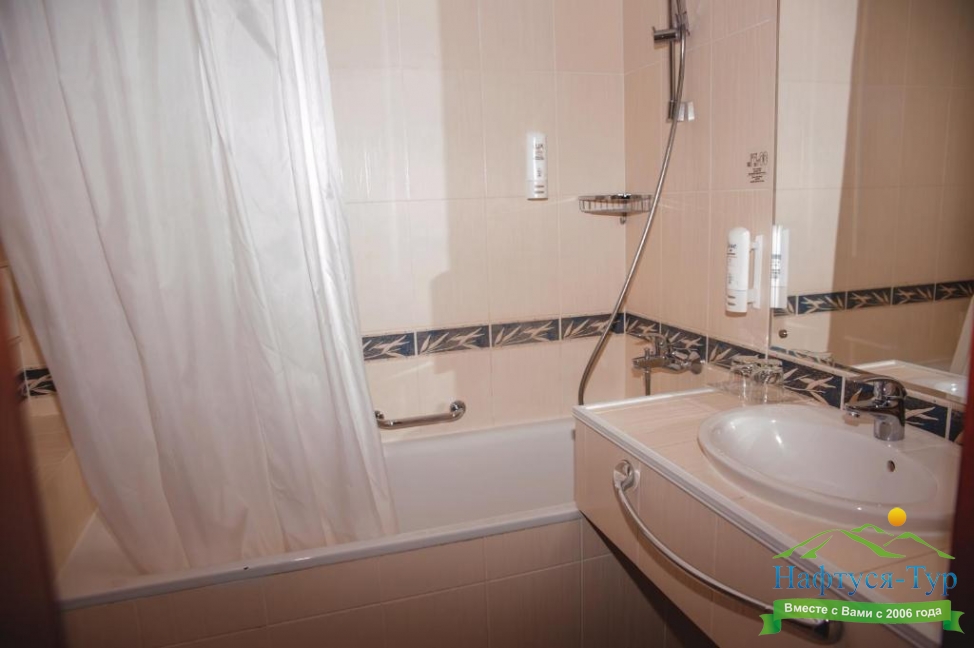 с ванной, тапочки, туалетные принадлежности, фен