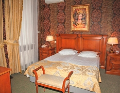 вешалка, диван, зеркало, кровать двуспальная, прикроватные тумбочки, стол, столик журнальный, стулья, тумба багажная, шкаф