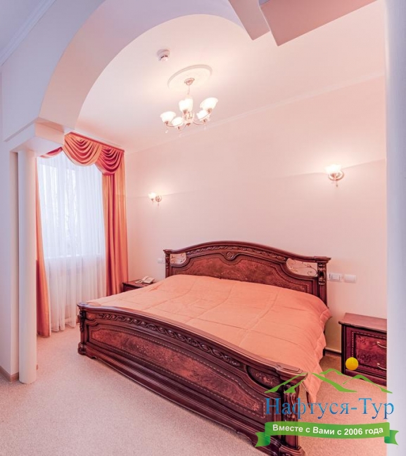 кровать двуспальная, прикроватные тумбочки, стол, стулья, шкаф