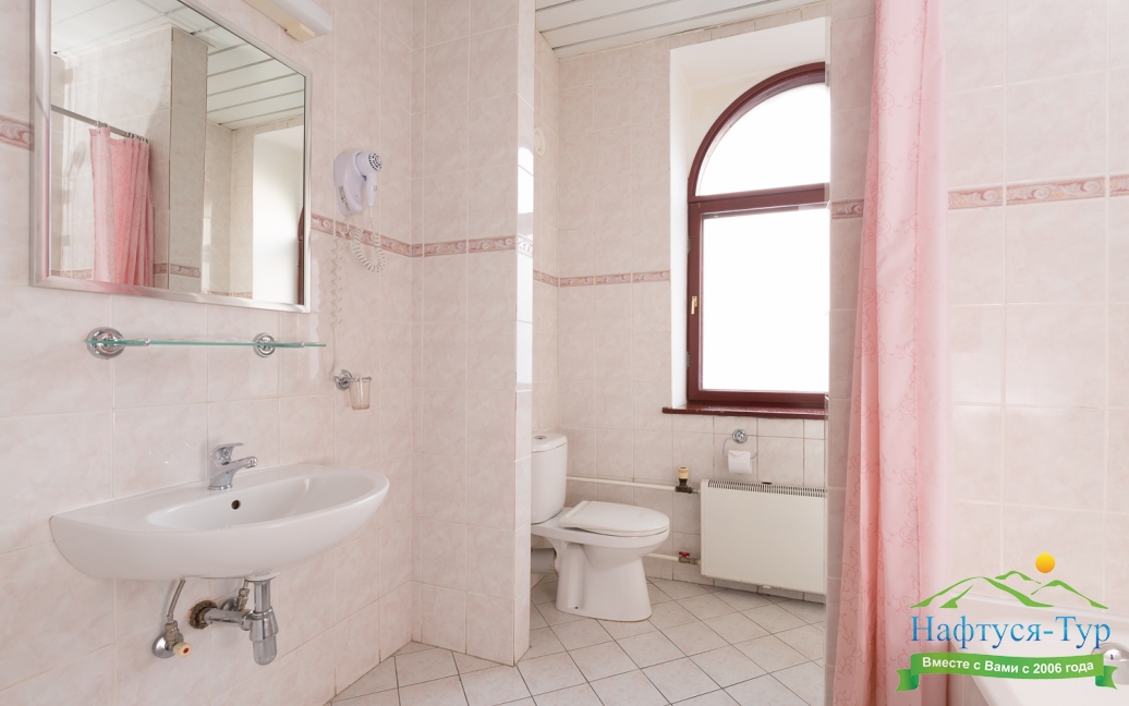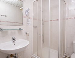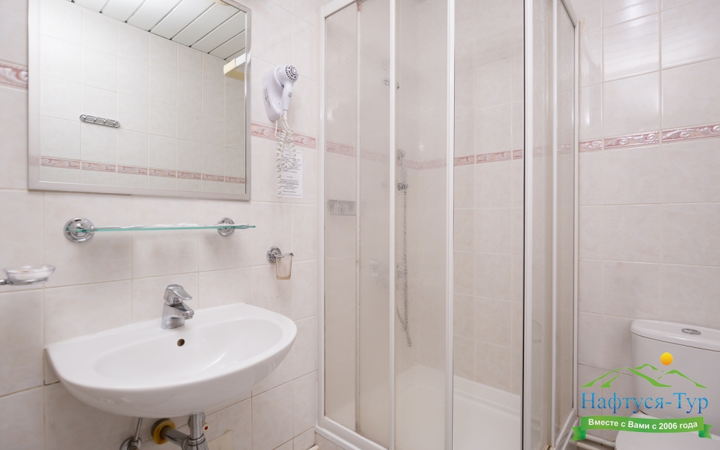 с ванной или душевой кабиной, туалетные принадлежности, фен