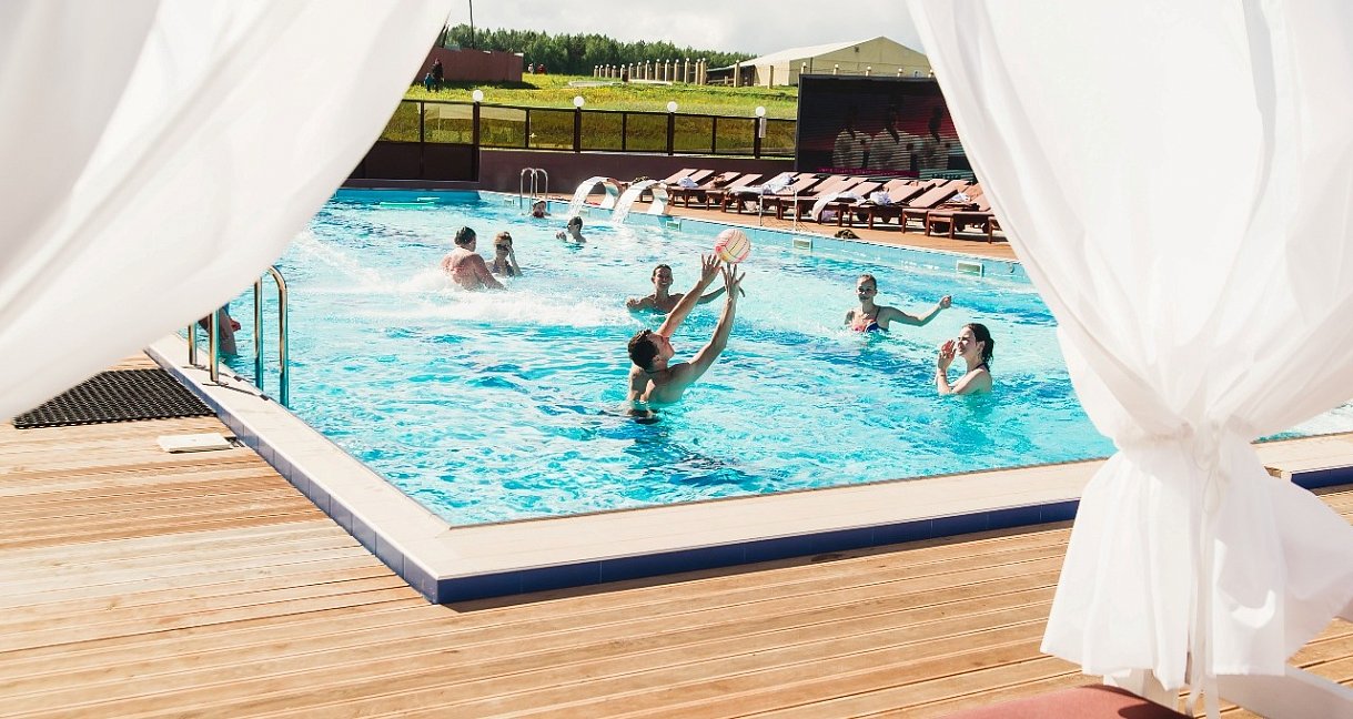Второй изюминкой клуба является СПА-комплекс. В него входят круглогодичный открытый термальный бассейн с пляжной зоной, сауна, 2 купели (одна из них с минеральными солями). При посещении бассейна полотенца, тапочки и халаты (при наличии) предоставляются центром.