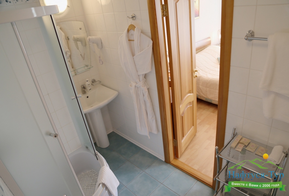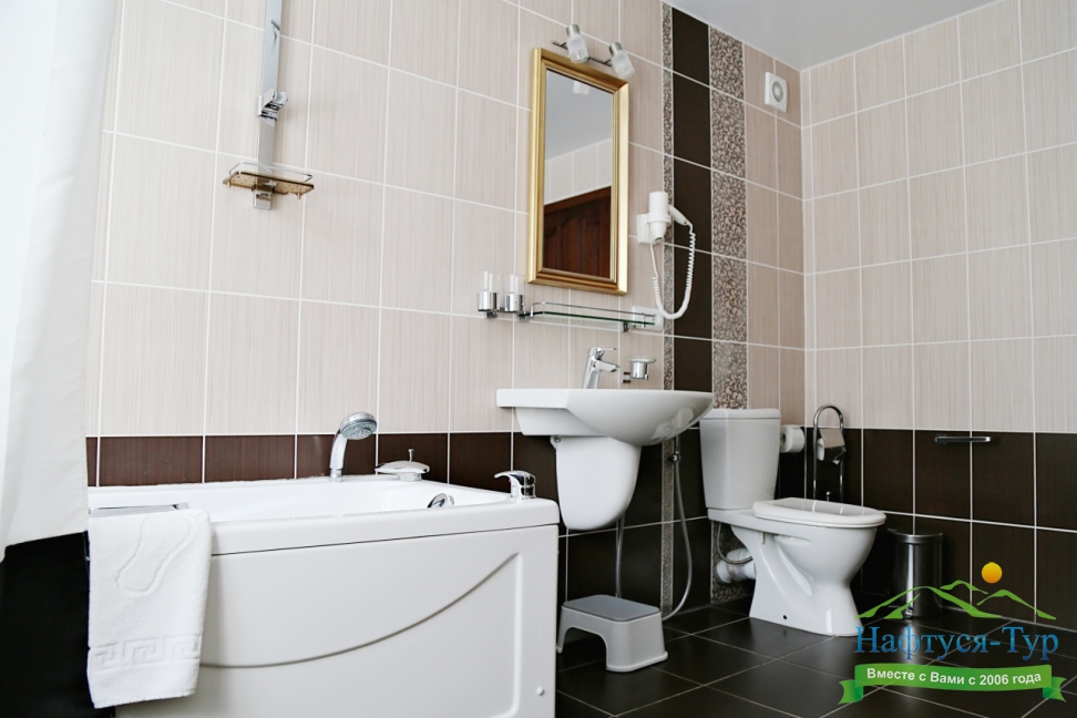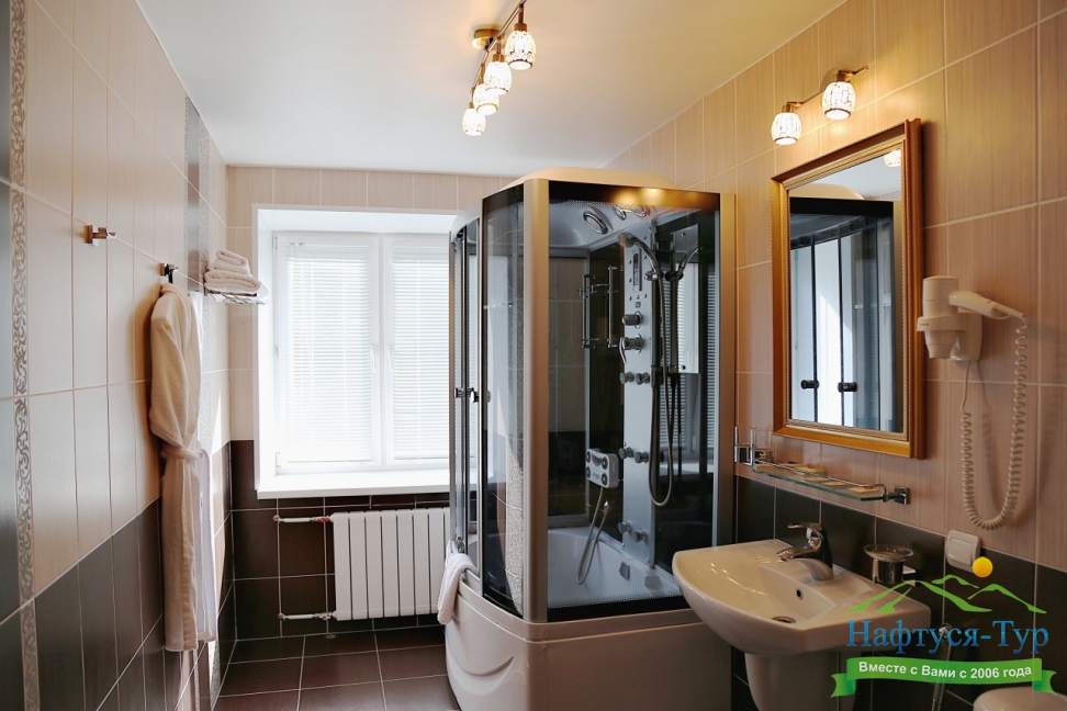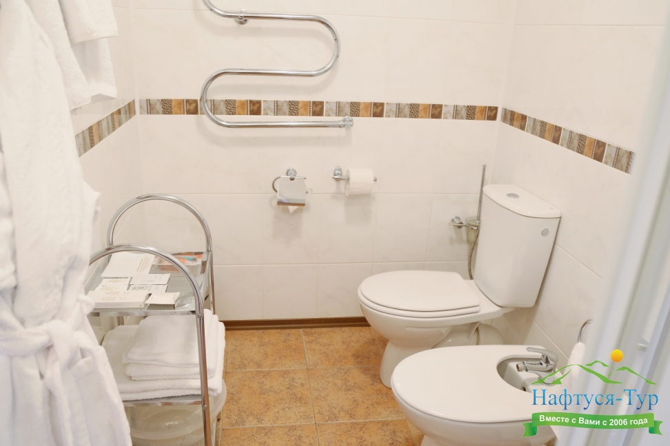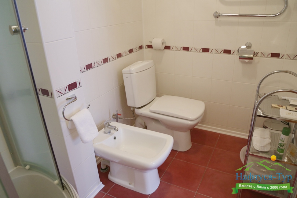 биде, с душевой кабиной, тапочки, туалетные принадлежности, фен, халат