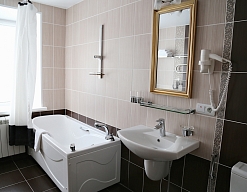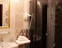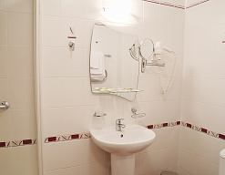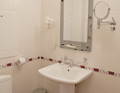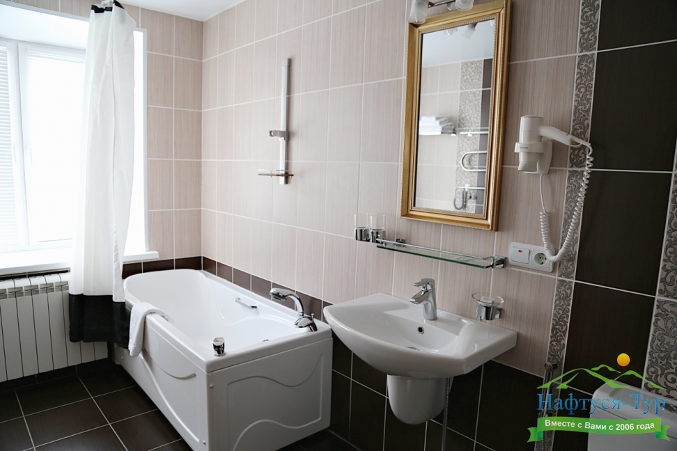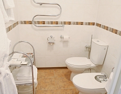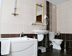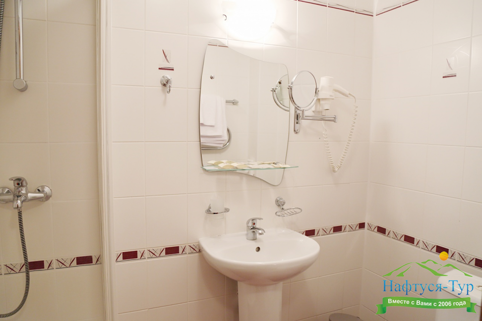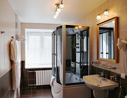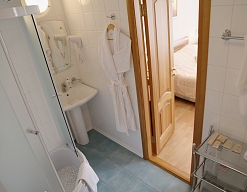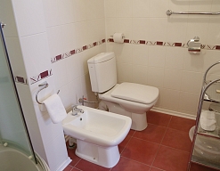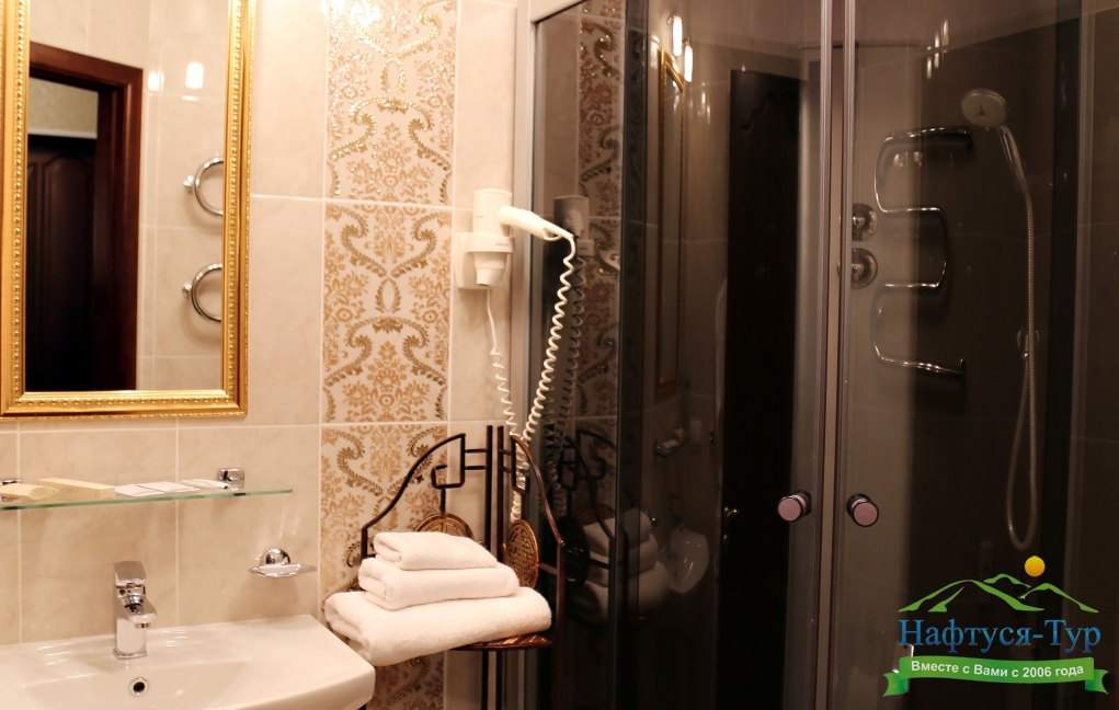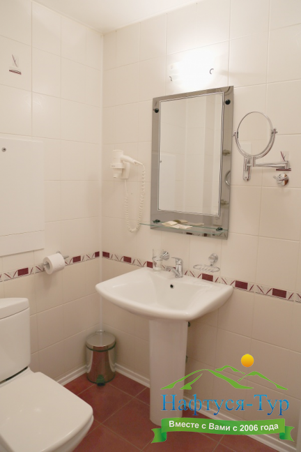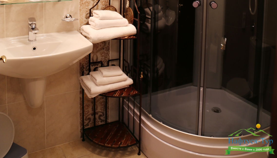 биде, с душевой кабиной, тапочки, туалетные принадлежности, фен, халат