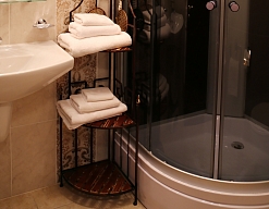 с душевой кабиной, тапочки, туалетные принадлежности, фен, халат
