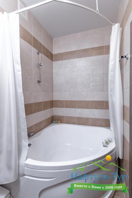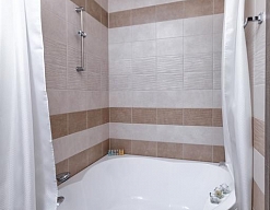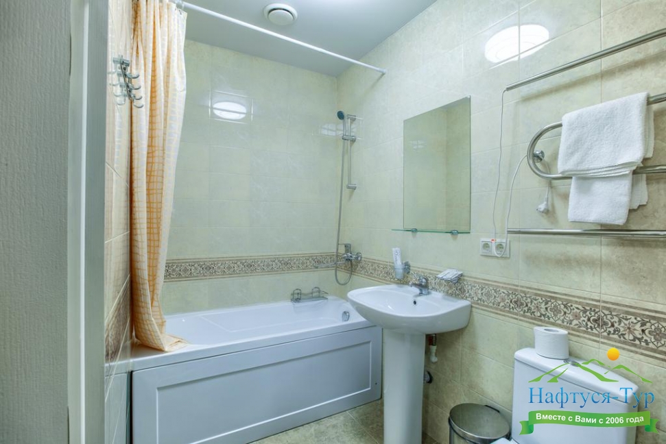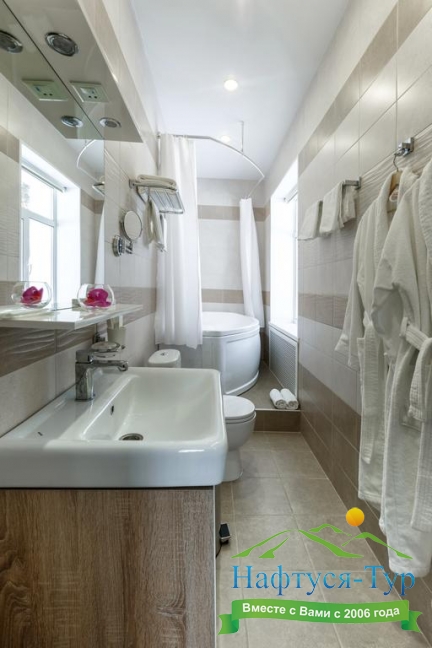 с ванной, тапочки, туалетные принадлежности, фен, халат
