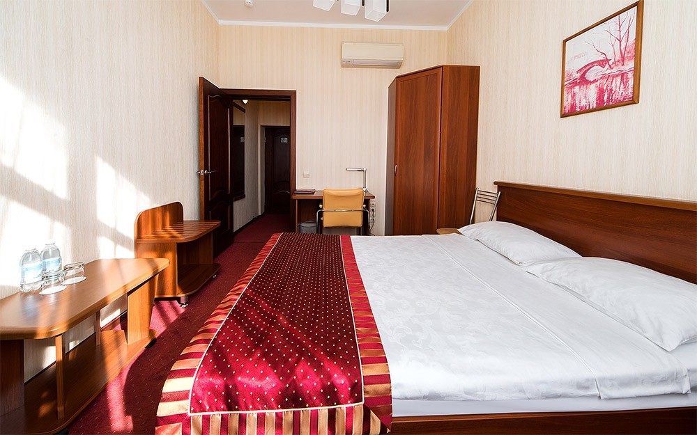 кровать двуспальная, прикроватные тумбочки, стол, стул, шкаф