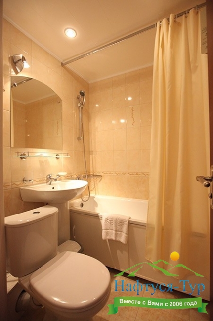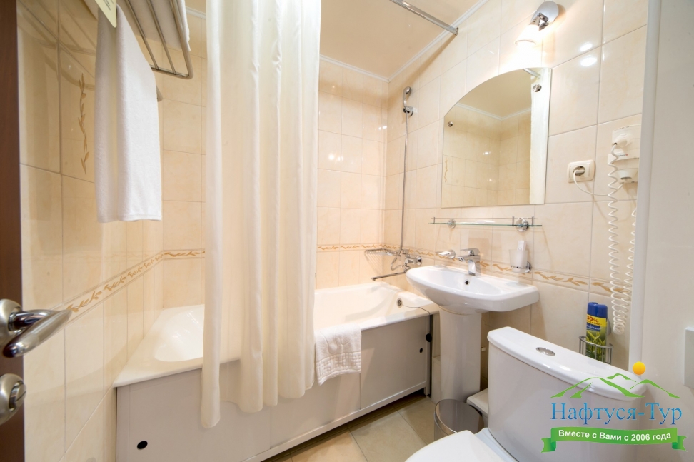 с ванной/душем, тапочки, туалетные принадлежности, фен