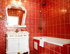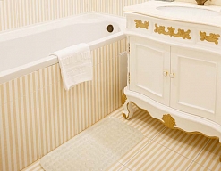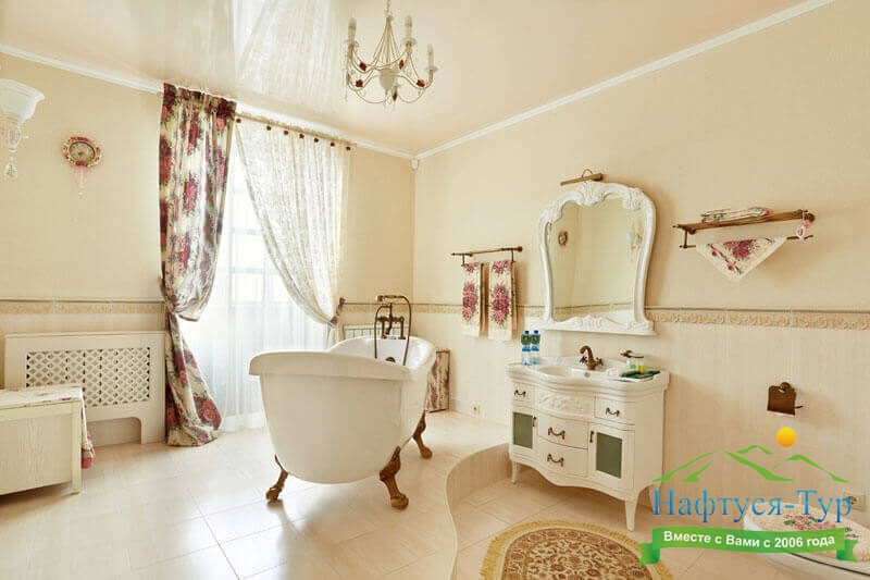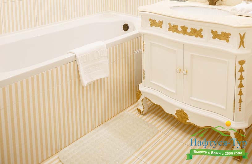 с ванной, тапочки, туалетные принадлежности, фен, халат
