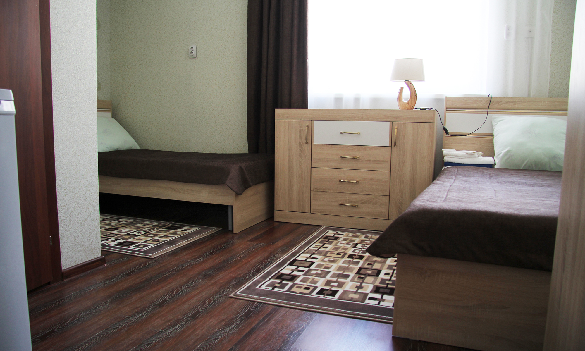 вешалка, зеркало, кровати односпальные, прикроватная тумбочка, стол, стул, тумба, шкаф, шкаф для посуды