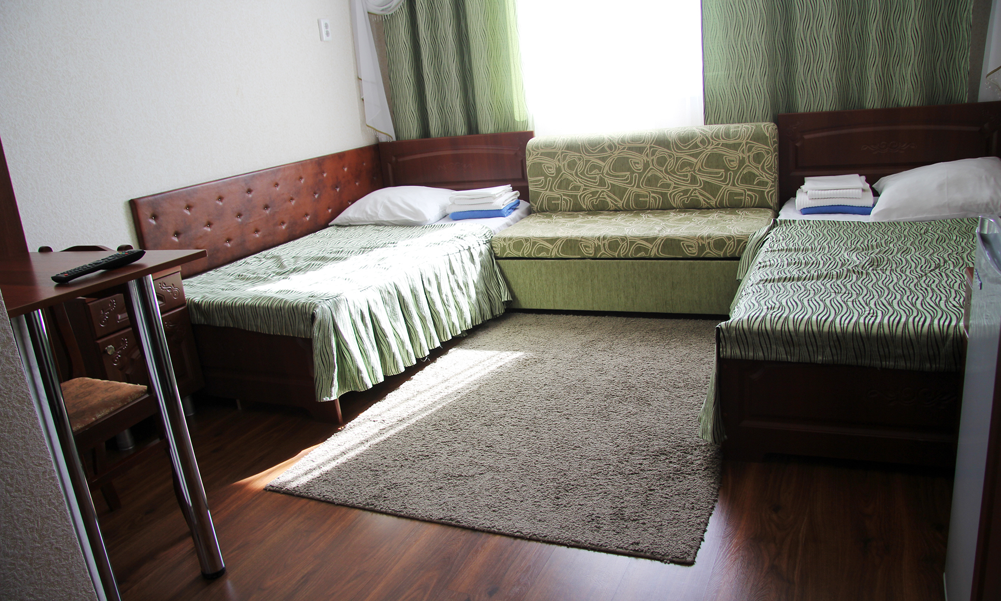 вешалка, диван, зеркало, кровати односпальные /одна двуспальная кровать, прикроватные тумбочки, стол, тумба, шкаф, шкаф для посуды