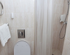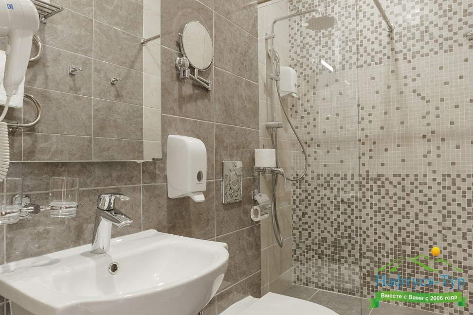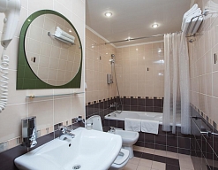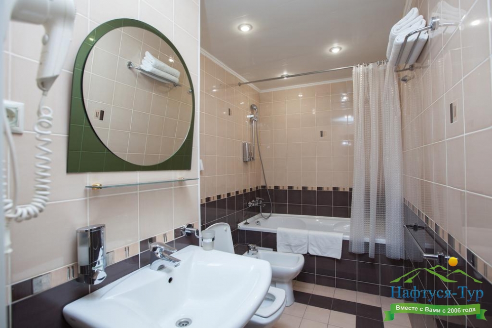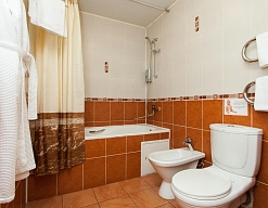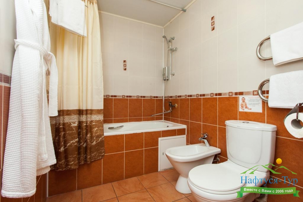 биде, с ванной, тапочки, туалетные принадлежности, фен, халат