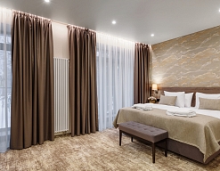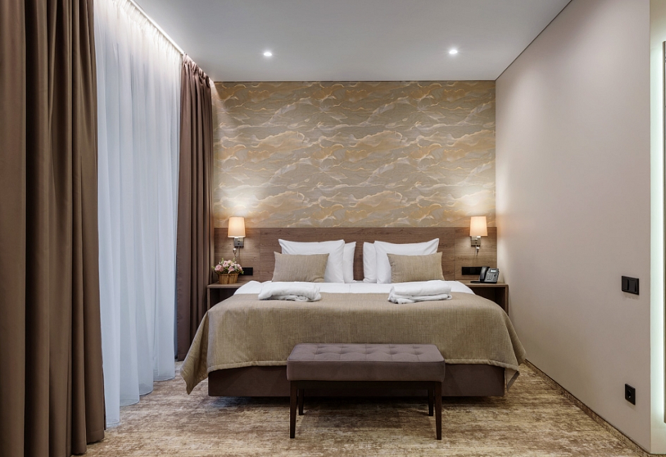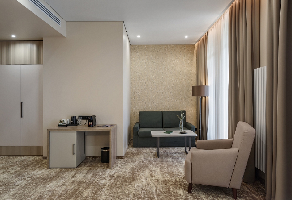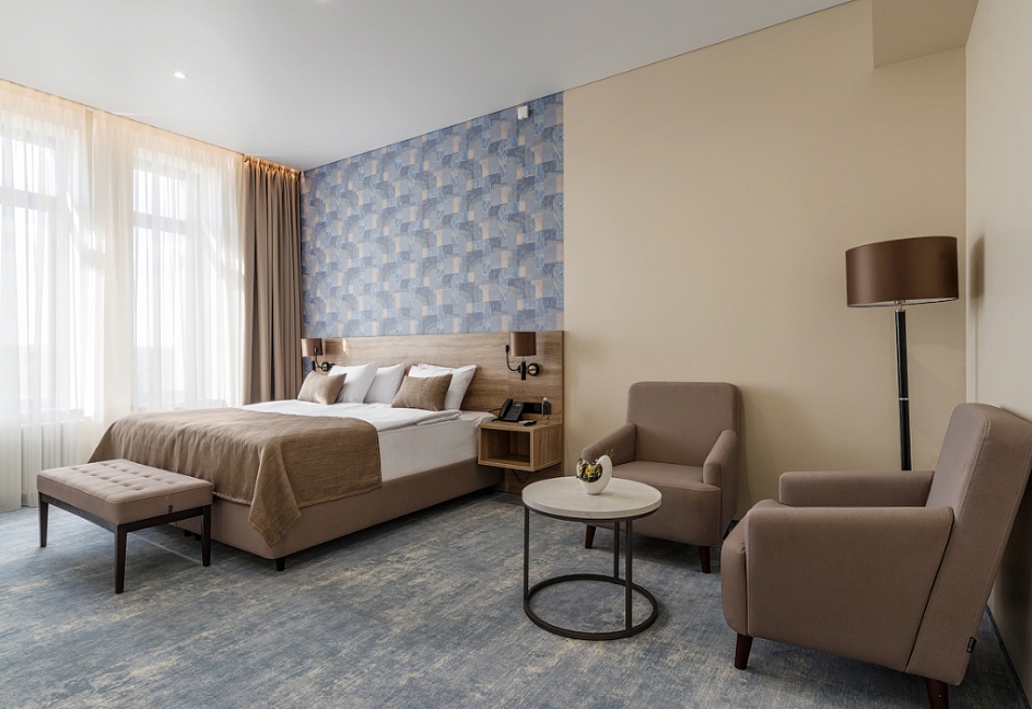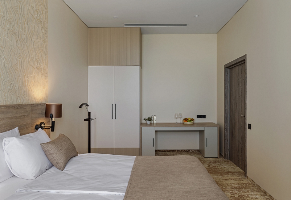 вешалка, зеркало, кресло, кровать двуспальная, прикроватные тумбочки, стол, тумба багажная, шкаф