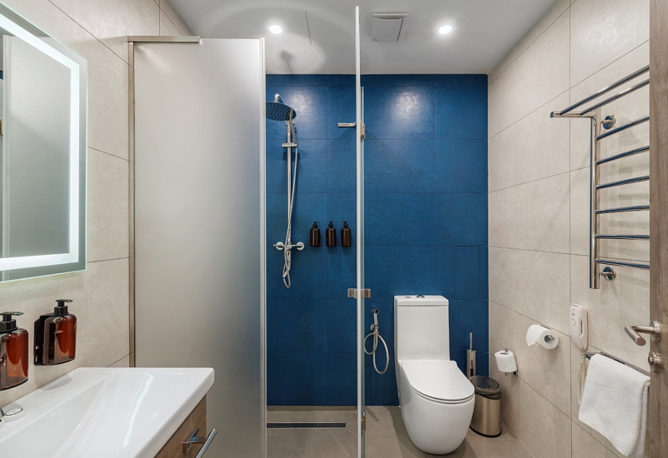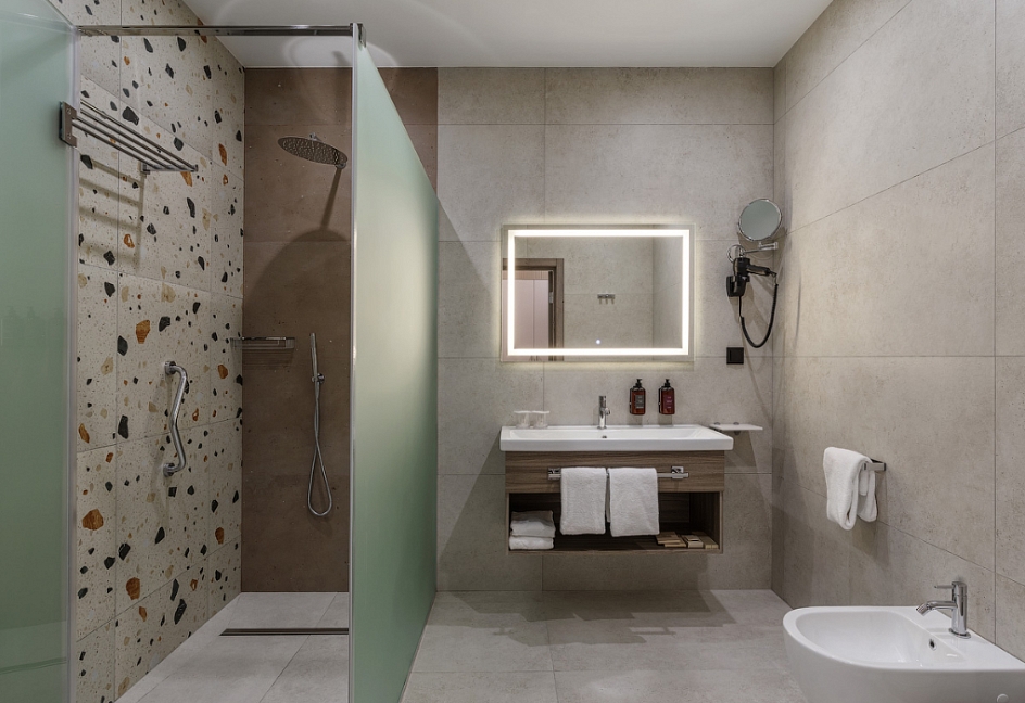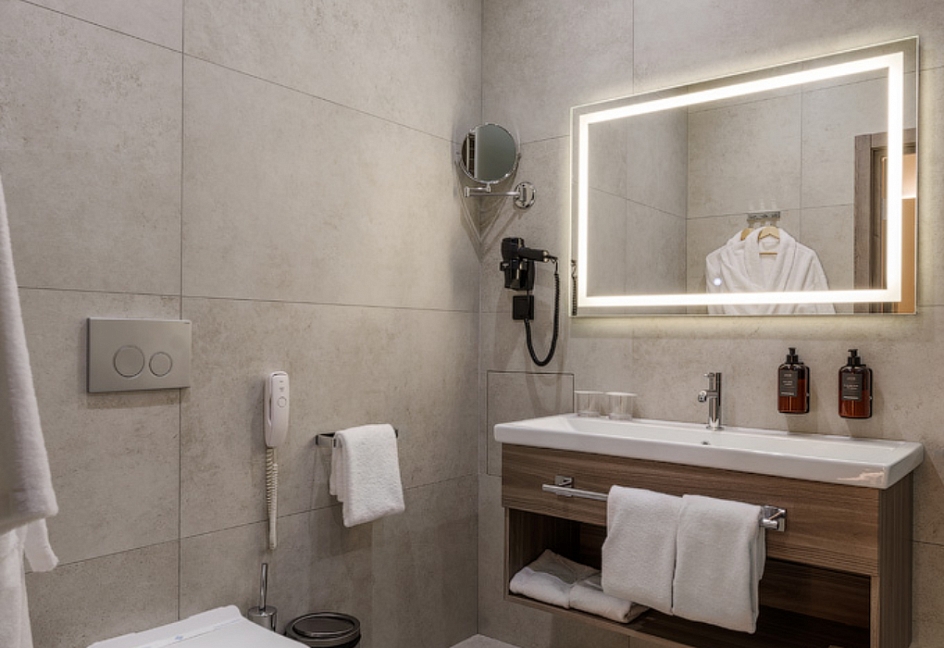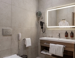 биде, с душевой кабиной, тапочки, туалетные принадлежности, фен, халат