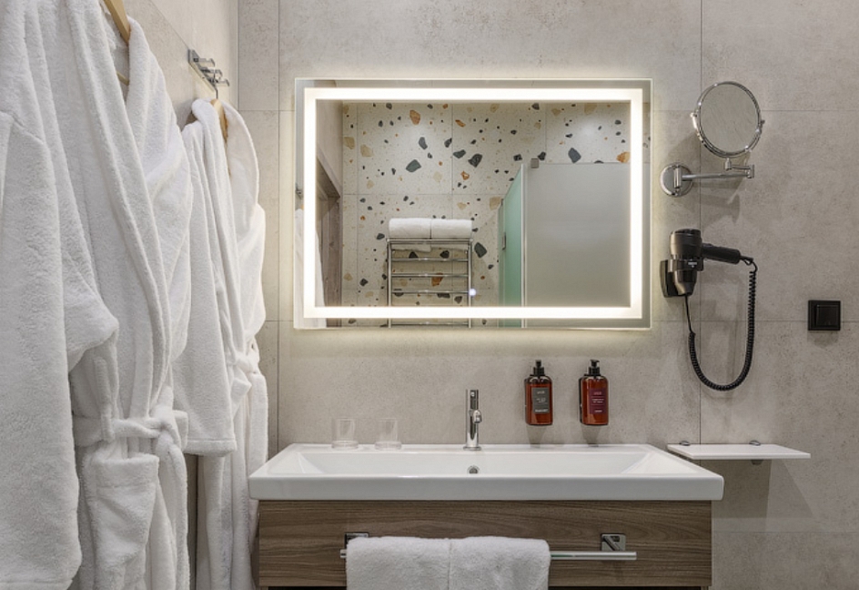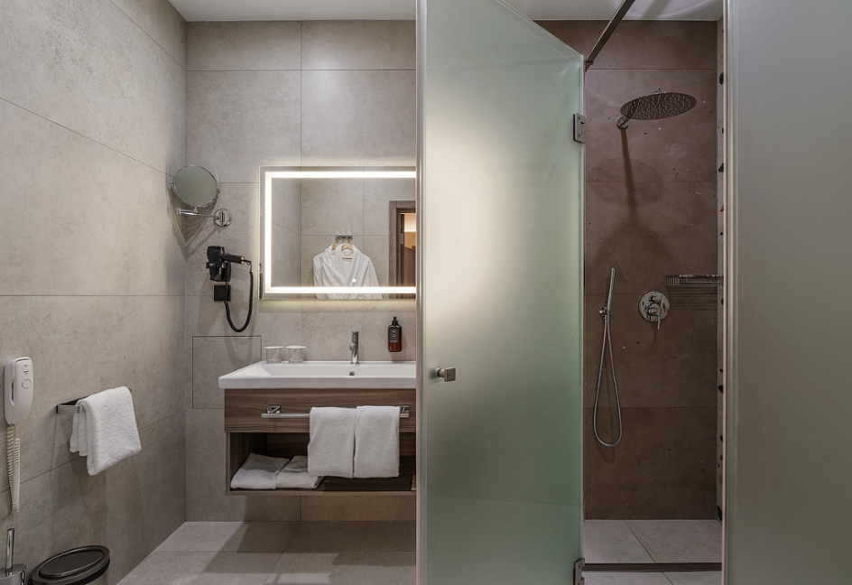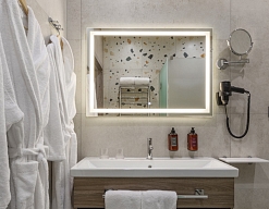 с душевой кабиной, тапочки, туалетные принадлежности, фен, халат