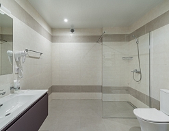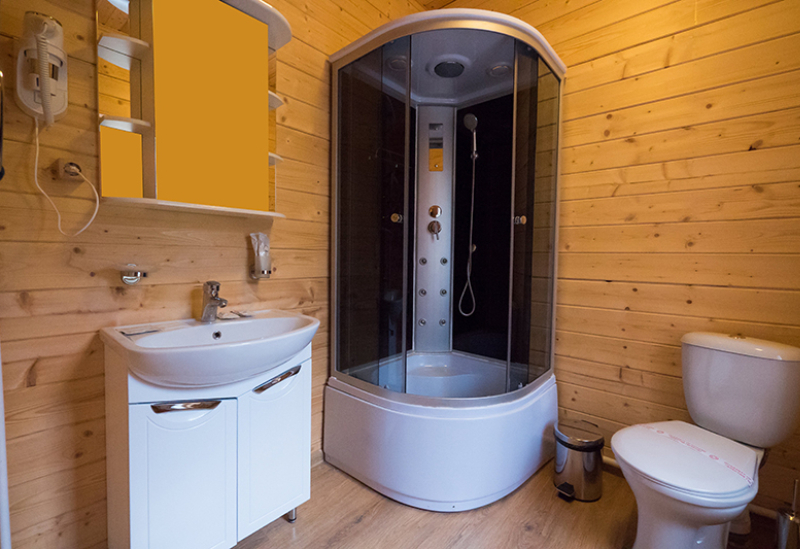 с душевой кабиной, туалетные принадлежности, фен