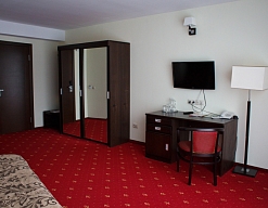 вешалка, зеркало, ковровое покрытие, кровать двуспальная, прикроватные тумбочки, стол, стул, шкаф