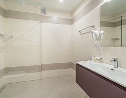 с ванной и душевой кабиной, тапочки, туалетные принадлежности, фен, халат
